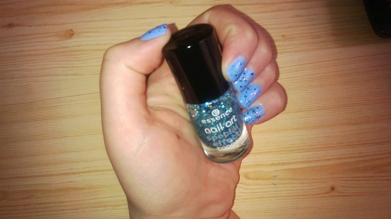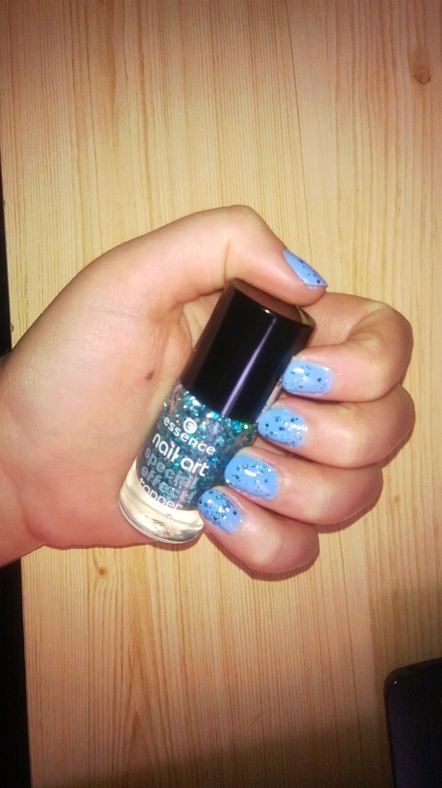 Alapnak a Twins lakkok egyikét használtam az edward elnevezésűt. Nekem nagyon tetszik ez a kék, kicsit hupikék törpikés :), amit feldobtam az Essence glorious aquarius fedőlakkjával. Elég sok csillámot vesz fel, úgyhogy elég belőle bőven egy réteg az ilyen végeredményhez.