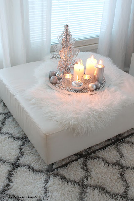 Azoknak akik a letisztult formákat szeretik, ideális lehet ez a túlnyomó részt fehér dekoráció. Az ezüst kellően kiemeli a fehér tisztaságát, már-már a hófödte hegycsúcsok jutnak eszembe. Szívesen eltöltenék ilyen hangulatban egy karácsonyt.