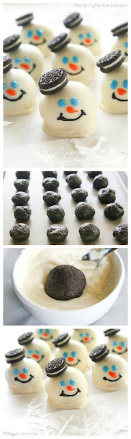 Maradva a édességeknél, idén nagyon szeretnék készíteni a mézeskalács mellé, ilyen hóember fejeket. Kókusz golyó alapot, olvasztott fehér csokiba belemártjuk, majd ételfestékkel szemet, orrot, és szájat varázsolunk a fehér gömbre. Oreo vagy egyéb más keksszel is díszíthetjük a tetejét. Ezt viszont lehet, hogy sajnálnám megenni...az első 5 percben.