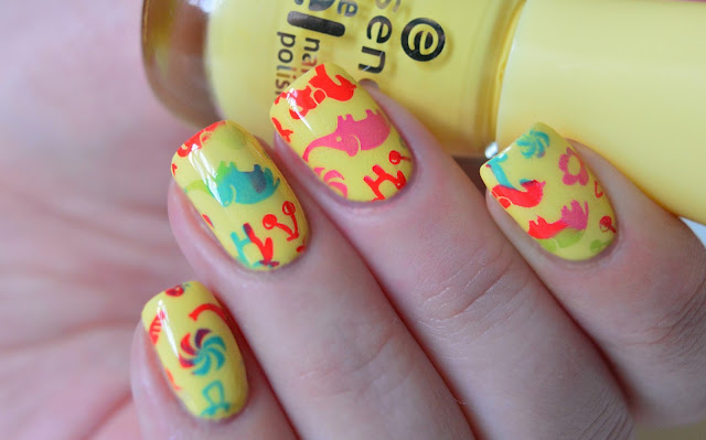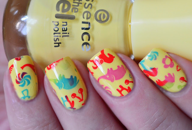 Abszolút a színekre helyeztem a hangsúlyt, hogy minél harsányabb legyen, minél színesebb. Az Essence sárgája tökéletes vidám alapnak bizonyult, a kék a lila, a zöld, a rózsaszín, valamint a piros mintáknak. A színeket a lemezre random mód pöttyöztem, azért ilyen furcsa az ombre hatás.
