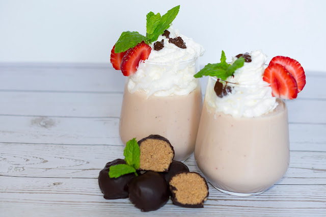 A hozzávalókat egy turmixgépe teszem vagy botmixerrel alaposan összeturmixolom, hogy sűrű állagot kapjak. Díszítésképpen tejszínhabot tettem rá, valamint félbe vágtam egy szem friss epret.